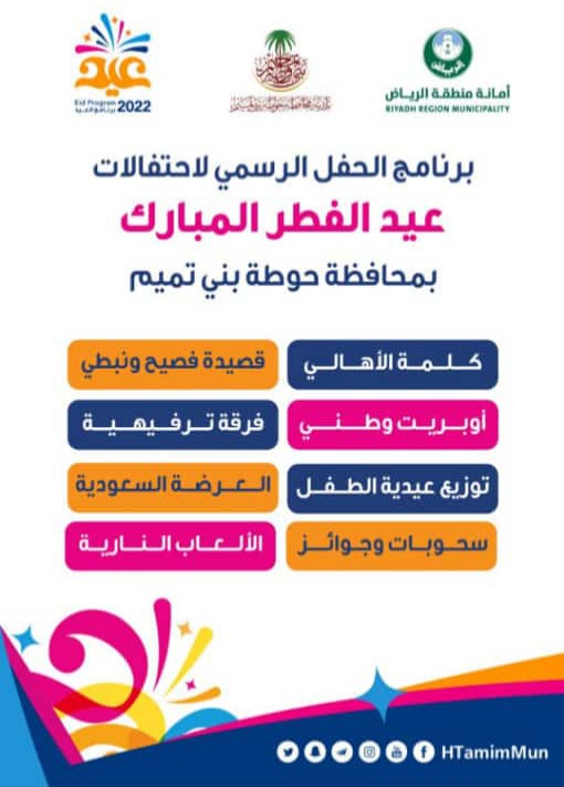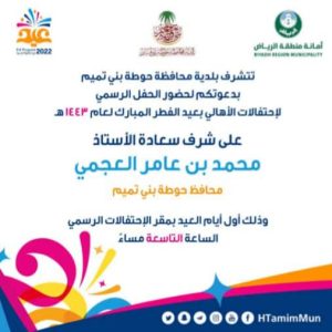 يشرف محافظ حوطة بني تميم الأستاذ محمدبن عامر العجمي ورئيس بلدية محافظة حوطة بني تميم المهندس رشيد بن عجب آل عمار الحفل الرسمي لاحتفالات عيد الفطر المبارك لأول يوم العيد .