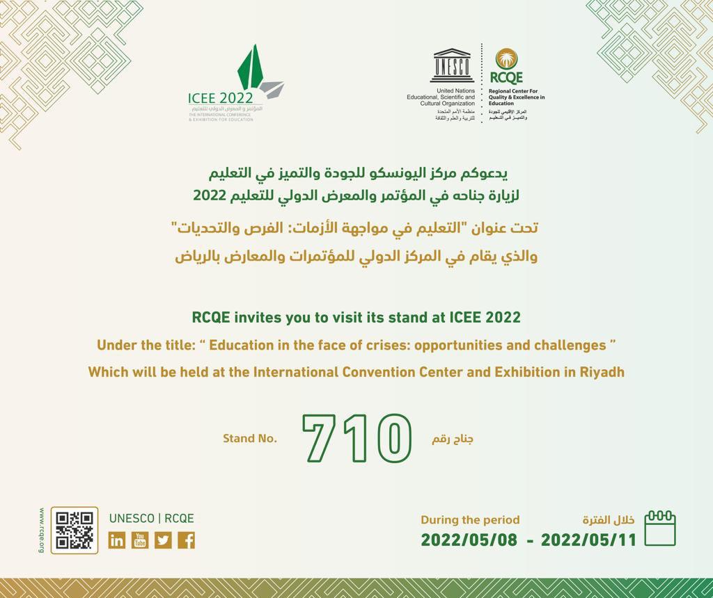 يشارك مركز اليونسكو الإقليمي للجودة والتميز في التعليم بالمعرض والمؤتمر الدولي للتعليم‬⁩ ⁦‪ICEE 2022‬⁩ بمركز الرياض للمؤتمرات خلال الفترة من 7 – 10 شوال الحالي الموافق ٨-١١ مايو ٢٠٢٢م من خلال جناح المركز المخصص داخل المعرض رقم ٧١٠.