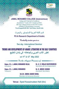أقامت كلية جمال محمد بجامعة بهاراتيداسان، الندوة الدولية التي تمحورت حول “تطور الأدب العربي واتجاهاته في بلدان الخليج” بتنظيم قسم اللغة العربية للدراسات العليا، حيث ألقى مؤسس مسرح كيف الكاتب والباحث ياسر مدخلي، من المملكة العربية السعودية، الكلمة الافتتاحية التي سلطت الضوء على تاريخ المسرح السعودي وتطوره وتطرقت إلى الأدب وارتباطه بالثقافة الهندية في بلدان الخليج العربي.