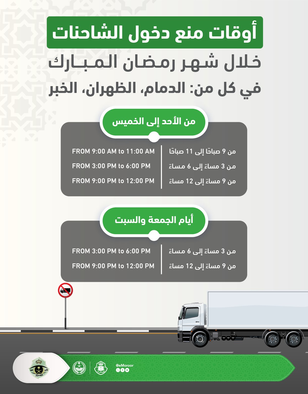 أعلنت الإدارة العامة للمرور عن تنظيم أوقات دخول الشاحنات في عدد من المدن والمحافظات خلال شهر رمضان المبارك، وذلك في إطار جهودها المستمرة لسلامة مستخدمي الطرق.