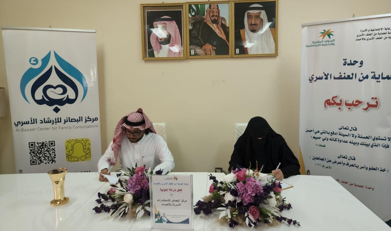وقعت وزارة الموارد البشرية والتنمية الاجتماعية بالأحساء ممثلة بوحدة الحماية من العنف الأسري بالاحساء شراكة مجتمعية مع مركز البصائر للاستشارات الأسرية بالأحساء صباح يوم الاثنين 14 ذو القعدة 1443 هجريا الموافق 13 يونيو 2022 ميلاديا .