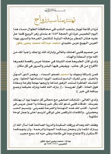 كتبها الجد / محمد يحيى أسود عكور هذه التهنئة بمناسبة زواج حفيده محمد عبد الله محمد يحيى عكور، حيث فاضت كلماته بأسمى معانى الحب والفرح بهذه المناسبة السعيدة.