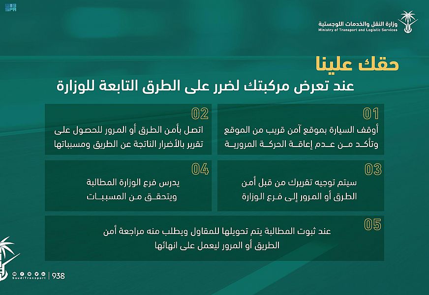 وأكدَتْ وزارةُ النقل والخِدْمَاتِ اللوجستية أنَّ لمستخدم الطريق حقًّا من خلال حفظ حقوقه في حال تَضَرَّرَتْ مركبتُهُ من الطريق؛وذلك عبر اتباع عدد من الخطوات التي تكفلُ لمستخدم الطريق حَقَّهُ ؛حيث أَوْضَحَتْ الوزارةُ أنَّ الخطوةَ الأولى تكمنُ في إيقاف السيارة بموقع آمن قريب من موقع الضَّرَرِ مع أهمية التأكيد على عدم إعاقة الحركة المرورية، والاتصال على أمن الطرق أو الإدارة العامة للمرور حسب موقع الضَّرَرِ، للحصول على تقرير بالأضرار الناتجة عن الطريق ومسبِّباته، على أن يُرسلَ التقريرُ بعد ذلك من أمن الطرق أو الإدارة العامة للمرور إلى فرع وزارة النقل والخِدْمَاتِ اللوجستية في المنطقة، فيما يقومُ بعد ذلك فرعُ الوزارة بدراسة المطالبة والتحقُّقِ من المسببات، وعند ثبوت المطالبة يجري تحويلها للمقاول ويُطْلَبُ منه مراجعةُ أمن الطرق أو الإدارة العامة للمرور ليعمل على إنهائها.