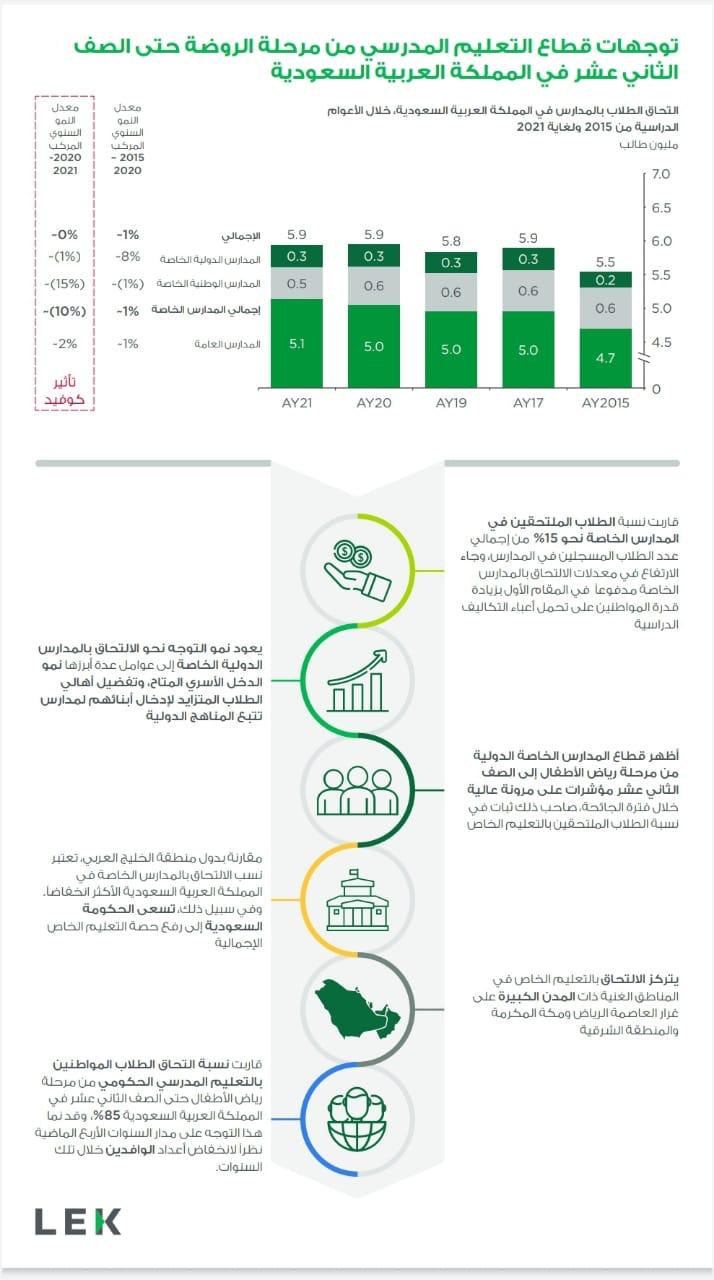 وأوضحت نتائج التقرير أنه ومن بين ما يقارب 5.9 مليون طالب مسجل في مراحل التعليم العام (رياض الأطفال إلى الصف الثاني عشر) في المملكة العربية السعودية، لم تتجاوز نسبة الطلاب الملتحقين في المدارس الخاصة نسبة 15% من إجمالي عدد الطلاب المسجلين في المدارس. وصحيح أن نسب الالتحاق بالمدارس الخاصة في مراحل التعليم العام منخفضة مقارنةً بالأسواق الرئيسية الأخرى في منطقة الشرق الأوسط وشمال أفريقيا، بما في ذلك دولة الإمارات العربية المتحدة وقطر والكويت والبحرين، إلا أن ذلك يدل على تفرد المملكة بهامش كبير للنمو في قطاع التعليم المدرسي الخاص.