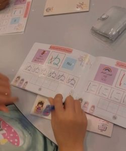 تعلم الأحرف اليابانية بمجموعتيها الهيراغانا والكاتاكانا وهي حروف صوتية ، يمثل كل منها مقطعًا صوتيًا واحدًا وهي أول أبجدية يتعلمها الأطفال اليابانيون في المدارس، ما يجعل من تعلمها أيسر وأكثر فعالية للمبتدئين.، وكذلك تعلم مجموعة واسعة من الكلمات، والتمكن من القراءة.